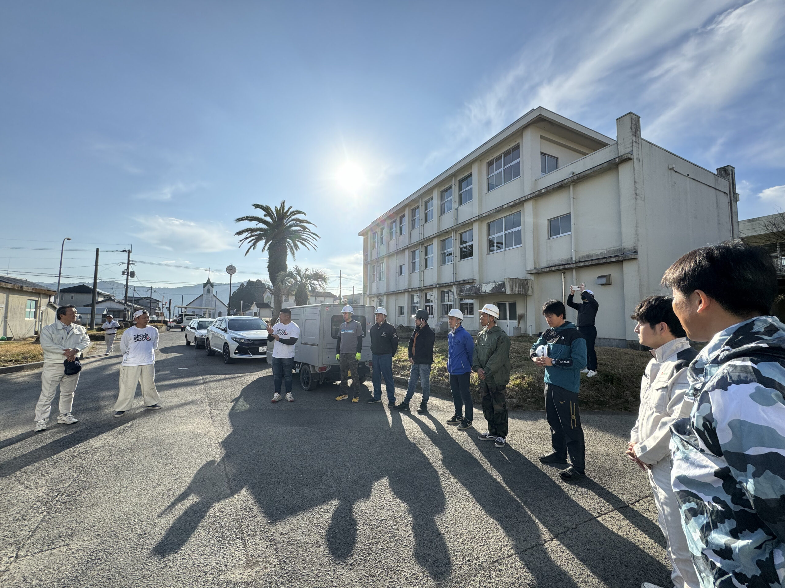 2月14日、塗装のボランティア団体として、全国の塗装会社約200社が所属している組織「塗魂ペインターズ」様ご協力のもと、九州各地から本校体育館校章・校名刻印のために駆けつけていただきました。